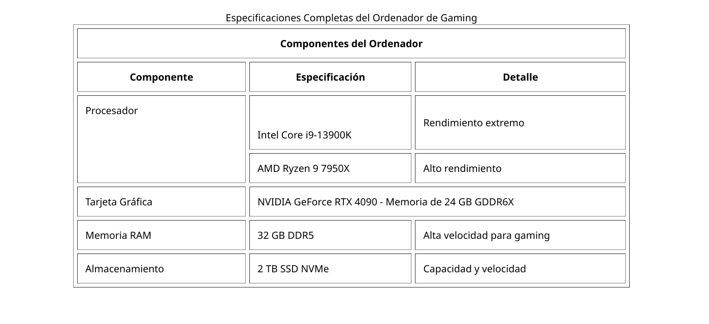 <caption align="top">Especificaciones Completas del Ordenador de Gaming</caption>
