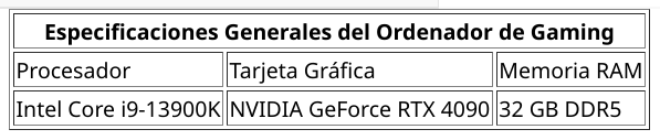 <th colspan="3">Especificaciones Generales del Ordenador de Gaming</th>
