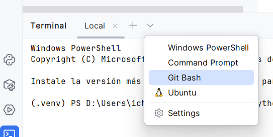 Al añadir un terminal en Pycharm y vscode sale la opción de que seleccionar gitbash