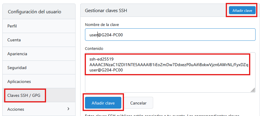 5. En Codeberg/Github los pasos son similares: ve a tu foto → Configuración → Claves SSH / GPG Keys → Add key