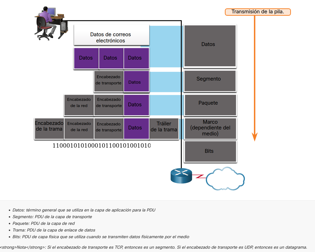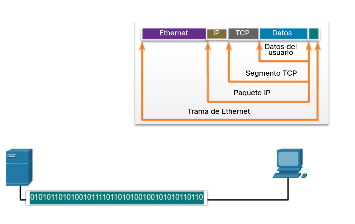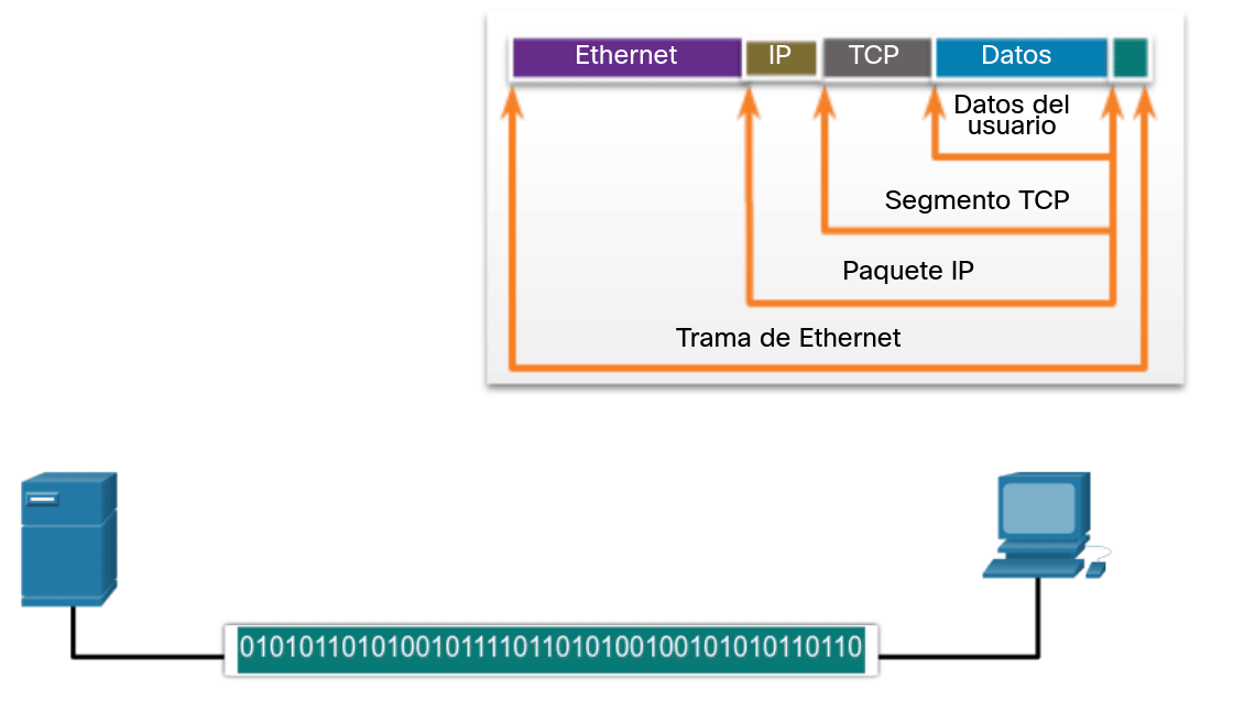 Mientras los datos de la aplicación bajan a la pila del protocolo y se transmiten por los medios de la red, se agrega diversa información de protocolos en cada nivel. Esto comúnmente se conoce como proceso de encapsulamiento.