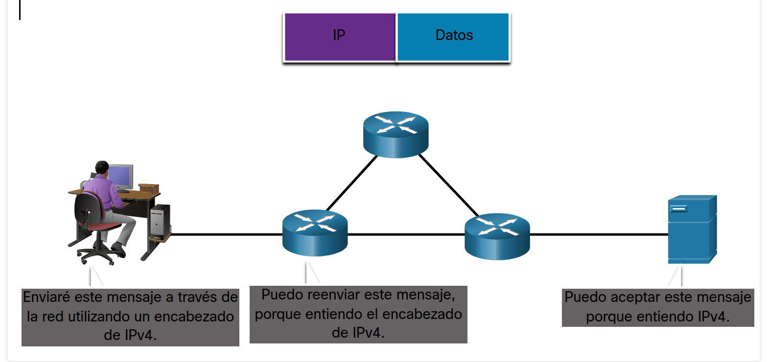 IP es responsable de enviar un mensaje desde el origen del mensaje al destino a través de una o más redes.