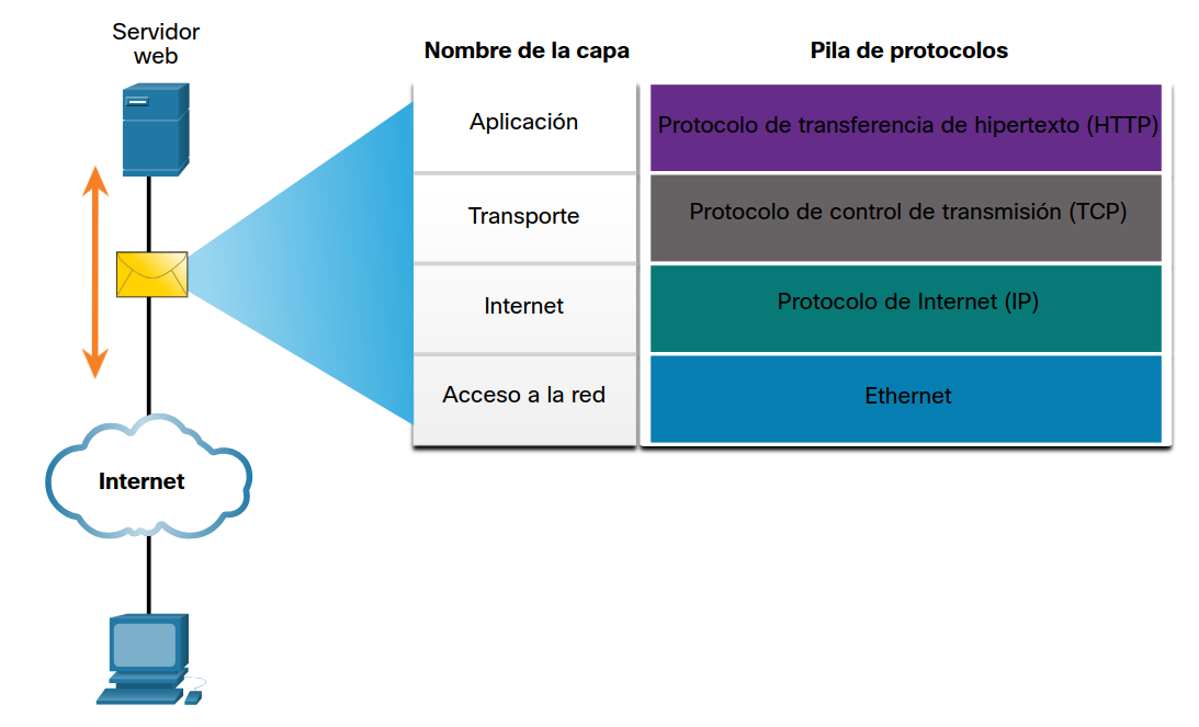 Una de las mejores formas para visualizar el modo en que los protocolos interactúan dentro de una suite es ver la interacción como una pila. Una pila de protocolos muestra la forma en que los protocolos individuales se implementan dentro de una suite. Los protocolos se muestran en capas, donde cada servicio de nivel superior depende de la funcionalidad definida por los protocolos que se muestran en los niveles inferiores. Las capas inferiores de la pila se encargan del movimiento de datos por la red y proporcionan servicios a las capas superiores, las cuales se enfocan en el contenido del mensaje que se va a enviar.