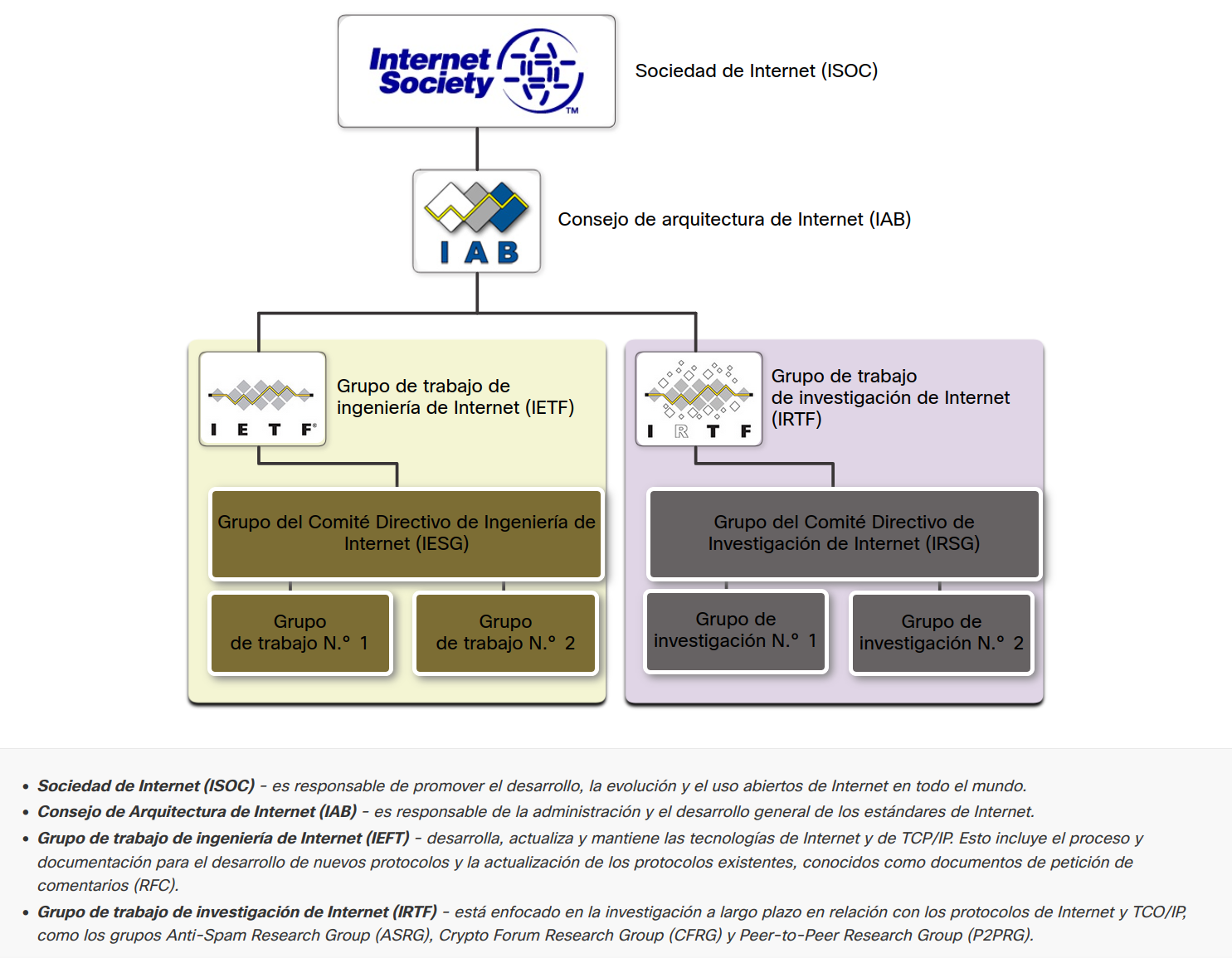 La figura muestra las organizaciones de estándares involucradas con el desarrollo y soporte de Internet.
