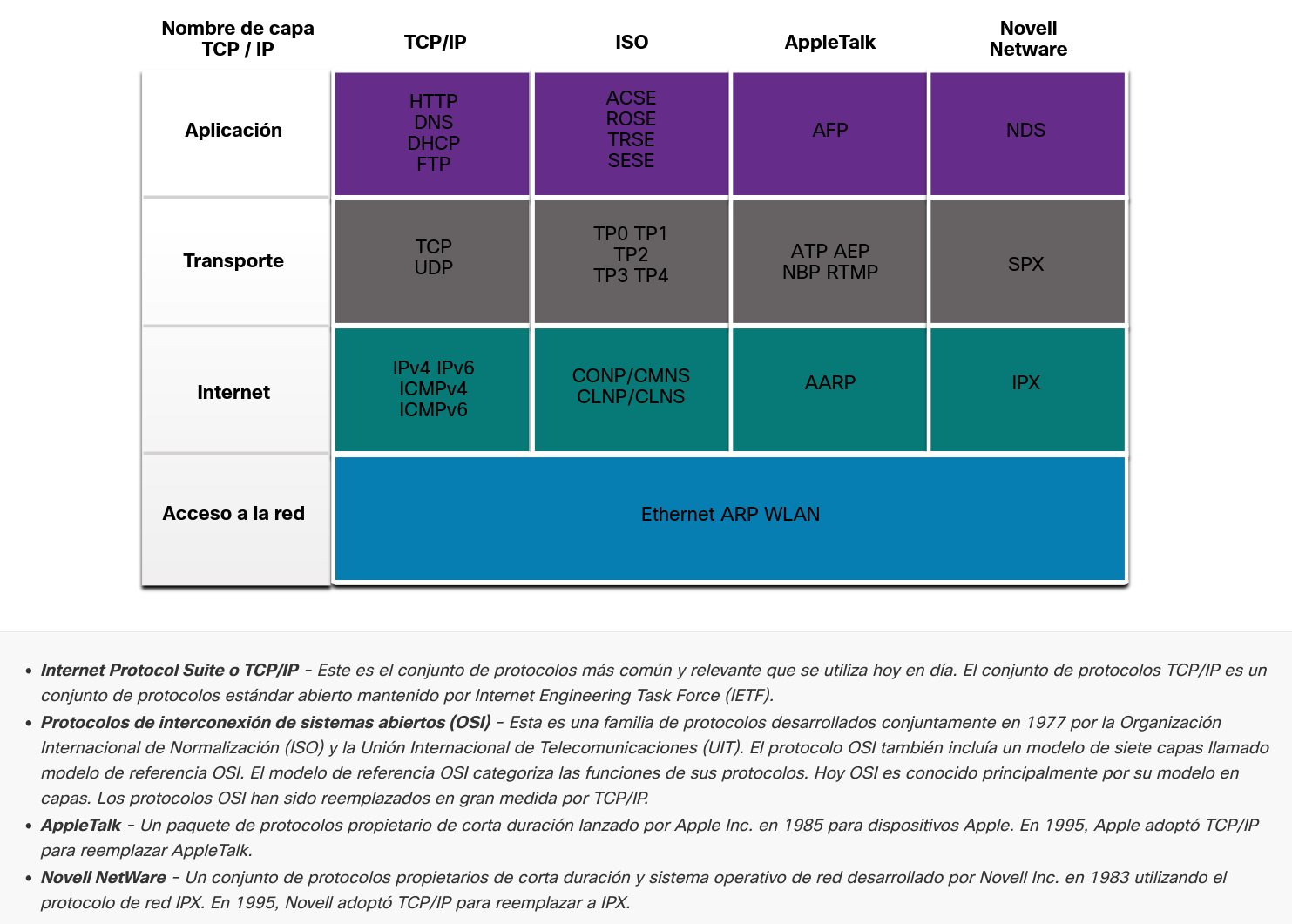 En la tabla se enumeran los distintos tipos de protocolos que se necesitan para habilitar las comunicaciones en una o más redes.