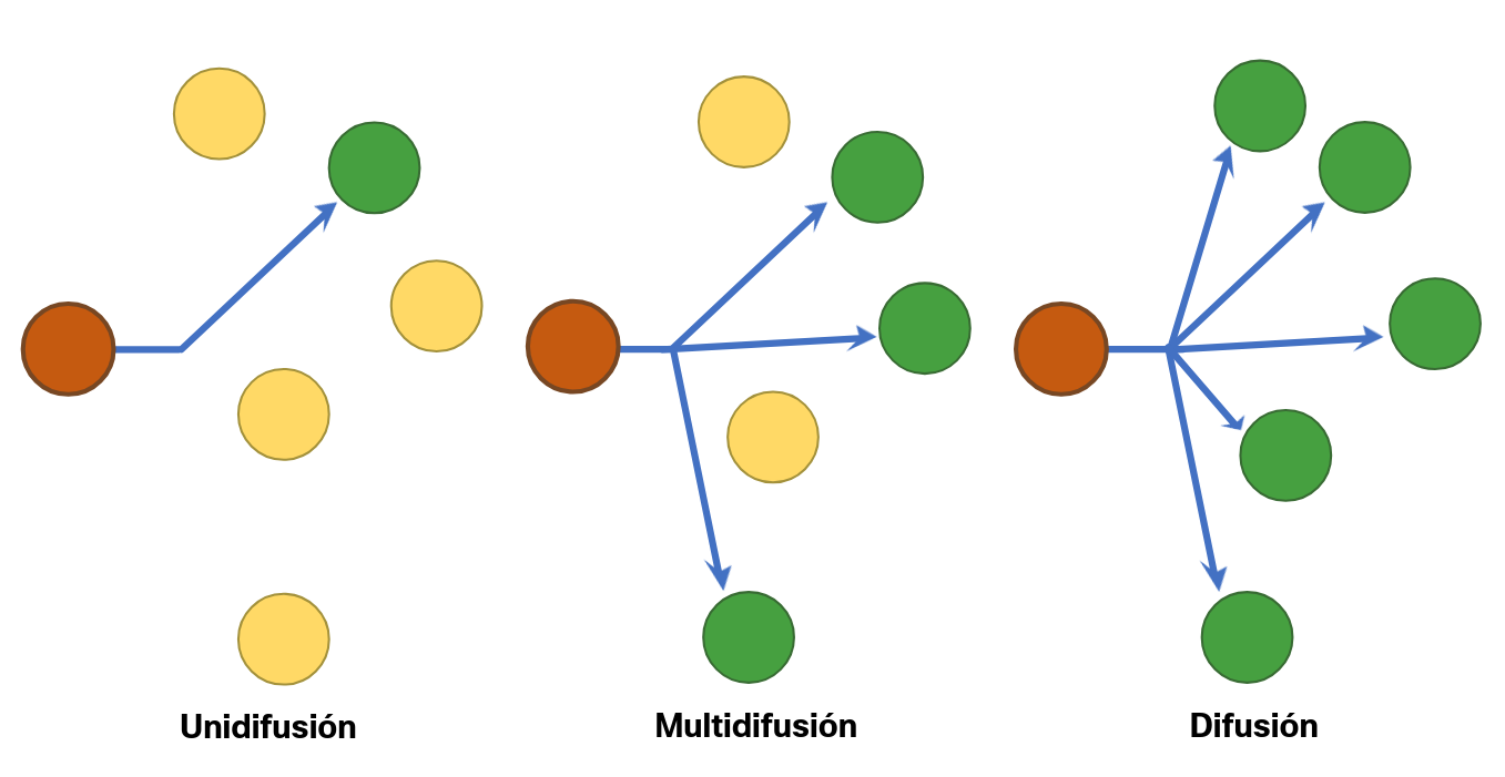En algunos casos, una persona desea comunicar información a un solo individuo. Otras veces, esa persona puede necesitar enviar información a un grupo de personas simultáneamente o, incluso, a todas las personas de un área.