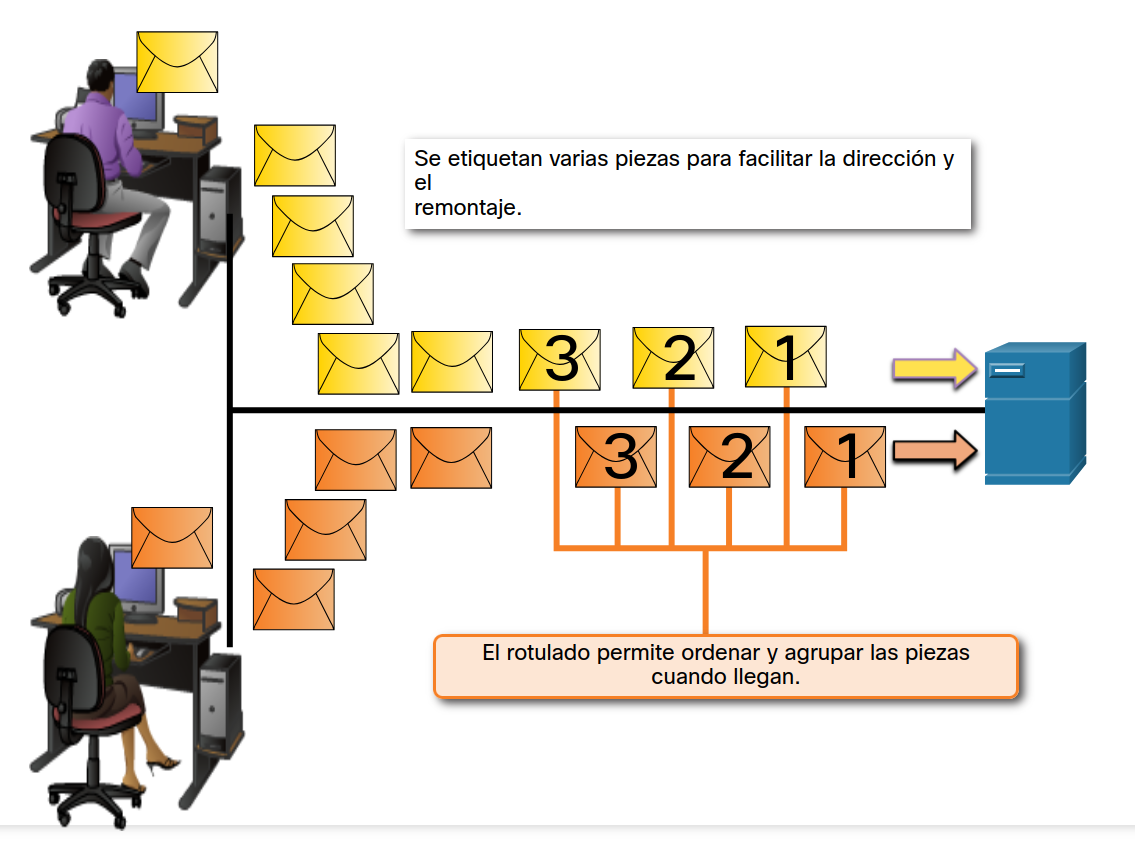 Cuando las personas se comunican, los mensajes que envían, normalmente, están divididos en fragmentos más pequeños u oraciones. El tamaño de estas oraciones se limita a lo que la persona que recibe el mensaje puede procesar cada vez, como se muestra en la figura. También hace que sea más fácil para el receptor leer y comprender.