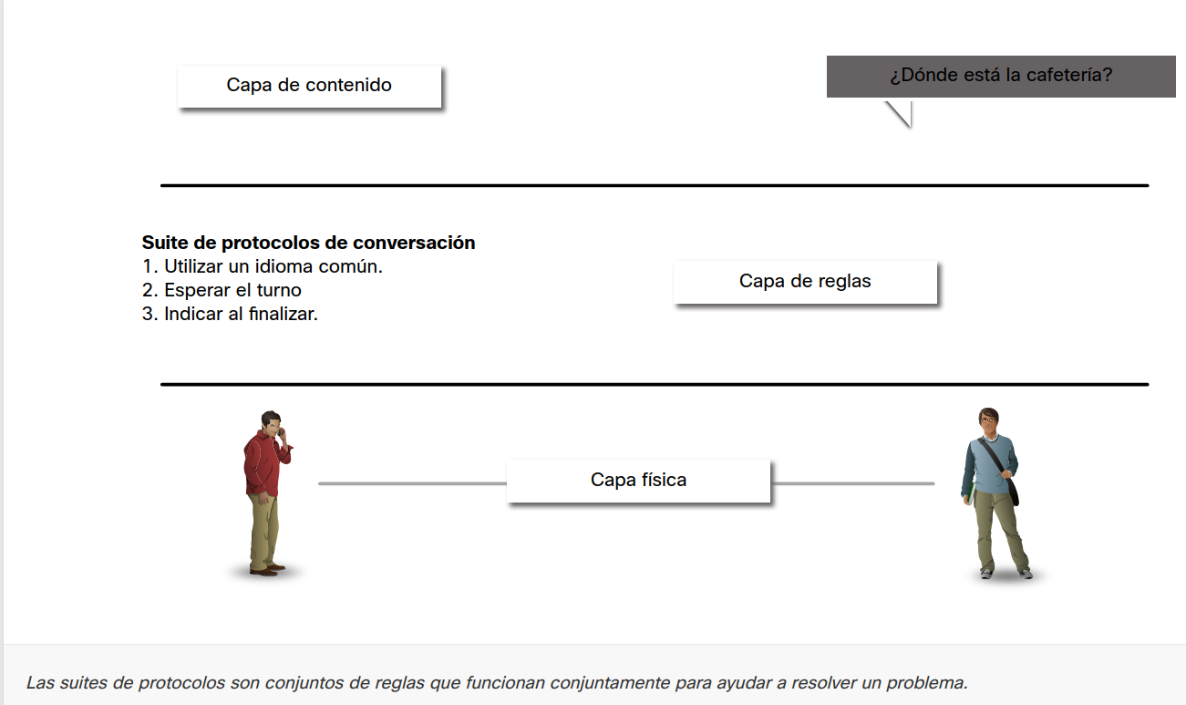 Como se muestra en la figura, podemos utilizar capas para describir la actividad que tiene lugar en el ejemplo de comunicación cara a cara. En la capa inferior, la capa física, hay dos personas, cada una con una voz que puede pronunciar palabras en voz alta. En el medio está la capa de reglas que estipula los requisitos de comunicación incluyendo que se debe elegir un lenguaje común. En la parte superior está la capa de contenido y aquí es donde se habla realmente el contenido de la comunicación.