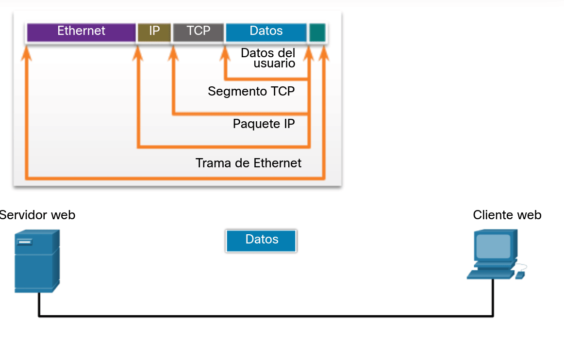Cuando se envían mensajes en una red, el proceso de encapsulamiento opera desde las capas superiores hacia las capas inferiores. En cada capa, la información de la capa superior se considera como datos en el protocolo encapsulado. Por ejemplo, el segmento TCP se considera como datos en el paquete IP.